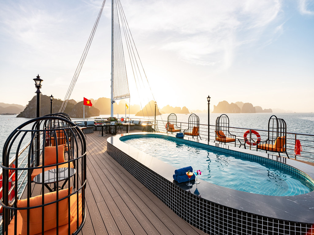 16:00 – Get ready for our Sunset Party on the cruise. Enjoy Vietnamese tea, fresh fruits and snacks on the sundeck, or in the jacuzzi, as we cruise past the scenic Hoa Cuong area, on of the bay´s highlights.